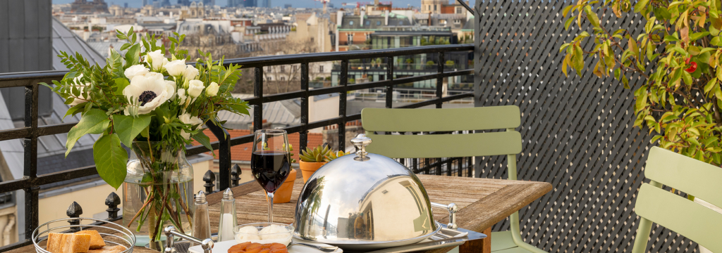The terraces of our hotel with a view of the Eiffel Tower are very much appreciated by our guests to enjoy memorable evenings contemplating the glittering Eiffel Tower. For successful and magical evenings, Le Littré hotel can offer you a bottle of champagne of your choice, an assortment of macaroons or a bouquet of flowers, available on request when you book your room with Eiffel Tower view.