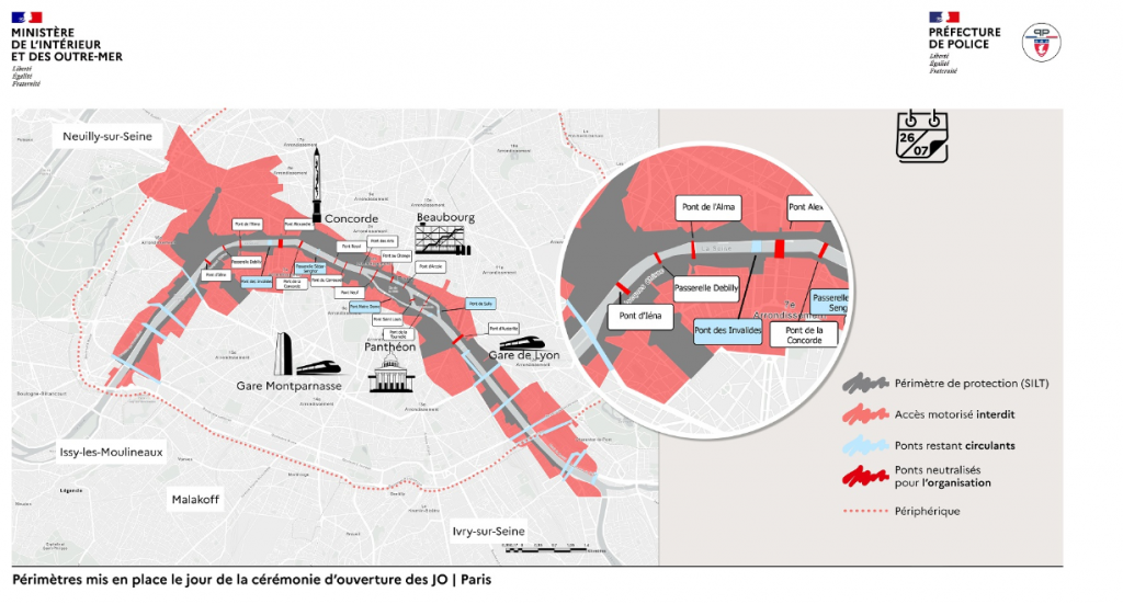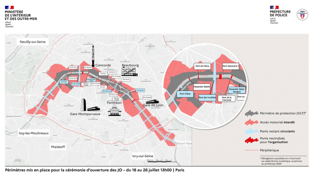 Quanto aos deslocamentos a pé, um código QR será necessário e obrigatório para atravessar o perímetro de segurança nas proximidades do local da cerimônia de abertura. Aberto desde 13 de maio, isso significa que agora você pode se inscrever para obter seu passe para se deslocar ao longo do Sena e ao redor do Arco do Triunfo, de 18 a 26 de julho, a semana anterior à cerimônia de abertura. A Île de la Cité, Île Saint Louis, Pont d’Austerlitz e Trocadéro também estão incluídos.