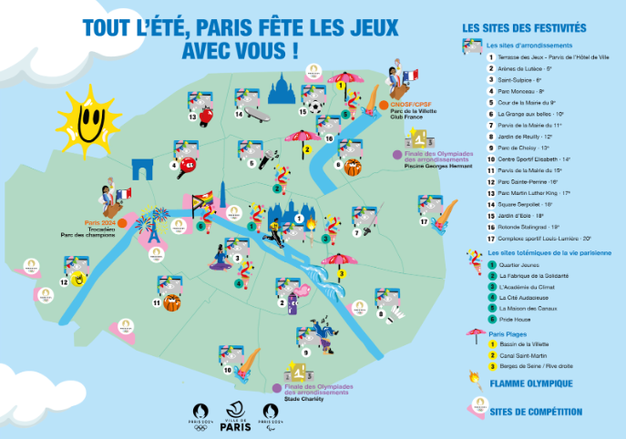 Várias fan zones serão estabelecidas, incluindo no Château de Vincennes, no Parc Georges Valbon em La Courneuve e na Île-Saint-Denis, que receberá a África Station, dedicada à cultura e ao esporte africanos. Essas áreas também oferecerão transmissões de competições, concertos, espetáculos e atividades esportivas. Locais emblemáticos como a Hôtel de Ville, a Academia do Clima e a Cité Audacieuse também oferecerão animações relacionadas a temas como solidariedade, igualdade e juventude.